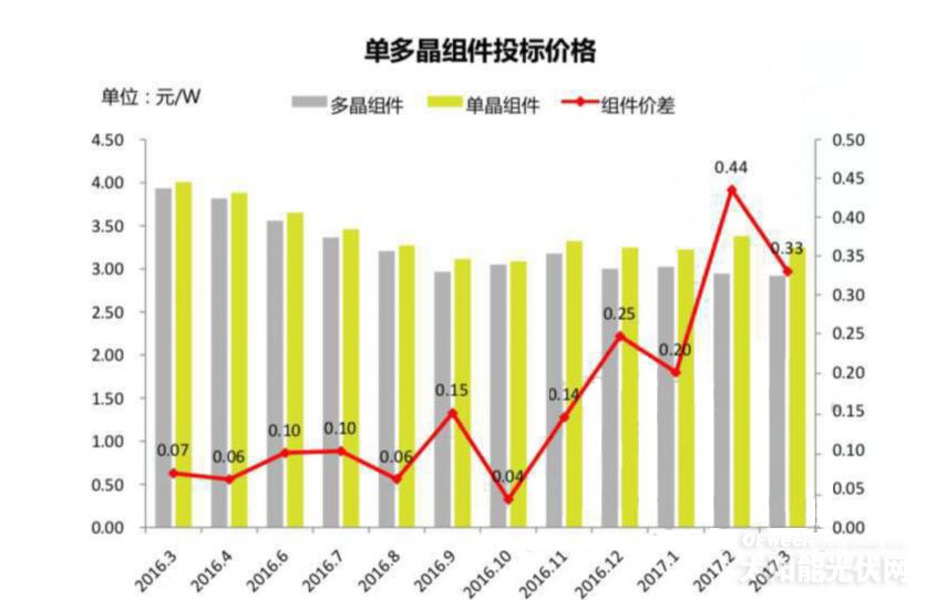 2016-2017年單多晶組件投標(biāo)價(jià)格統(tǒng)計(jì)圖