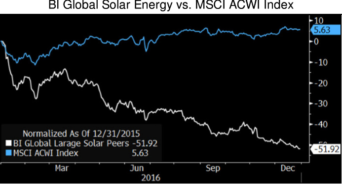 據彭博行業研究平臺消息,2016年,全球大型太陽能行業集團股價下跌幅度達52%,表現不佳,同期MSCIACWI指數上漲幅度為5.6%。美國光伏巨頭SunEdison在去年4月份提交破產保護申請,加重了行業內的消極情緒,與此同時,美國住宅用太陽能設備發展速度緩慢,2017年相關項目數量降低。除此之外,中美貿易持續的緊張局勢、中國2020年增長目標放緩以及去年下半年開始的國內太陽能設備需求放緩給那些面向中國市場的設備生產商帶來壓力,這些趨勢可能會持續到2017年。