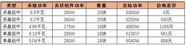 從兩個表格中可以看出,同樣號稱5kW的發電系統,由于光伏組件的功率差異,價格不但有區別,補貼收入一樣有影響。有的人說了,單晶組件的發電量要比多晶組件的發電效率高。那么,同樣功率的多晶組件和單晶組件,單晶每天多發出來的電量也是非常有限的。兩項同時參考,價格差異也是輕松超過一千元。