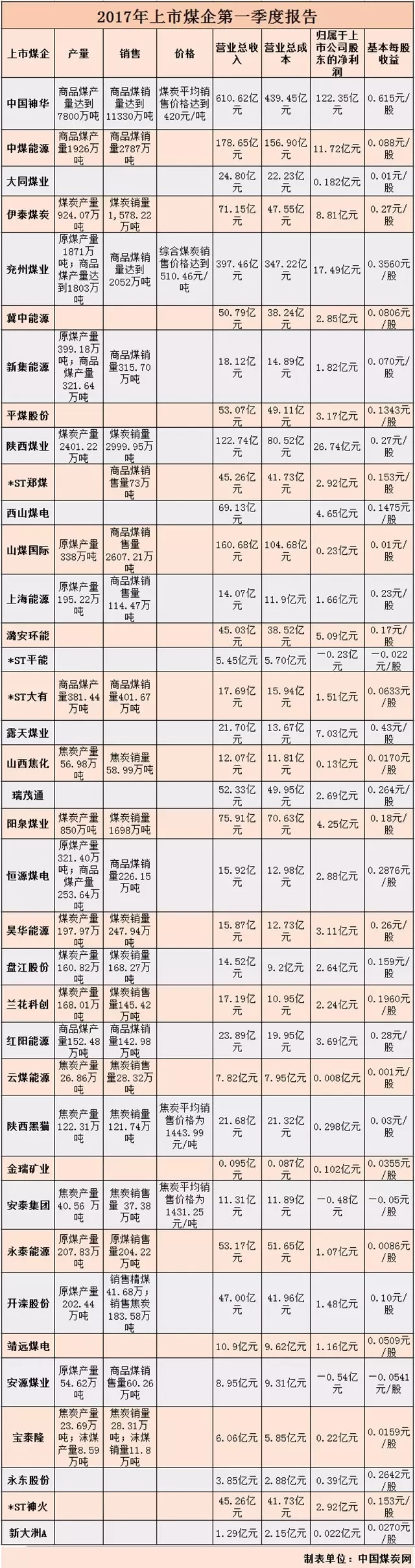 全年業(yè)績(jī)剛過不久,4月迎來(lái)首季業(yè)績(jī)報(bào)告,截至5月4日,37家煤炭企業(yè)發(fā)布了2017年一季報(bào),小編已經(jīng)全部整理了出來(lái),多家煤炭股企業(yè)的業(yè)績(jī)亮眼,中國(guó)神華、兗州煤業(yè)等利潤(rùn)都大升,煤炭行業(yè)的春天來(lái)了嗎?