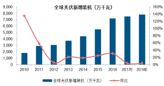 預(yù)計(jì)2017-2018 年全球光伏裝機(jī)將維持穩(wěn)態(tài)發(fā)展,年化增速在 5%左右