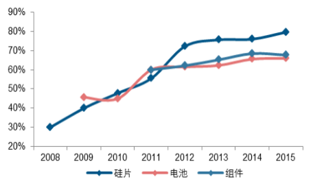 2015 年我國(guó)硅片、電池、組件環(huán)節(jié)產(chǎn)能均占全球 70%以上