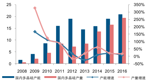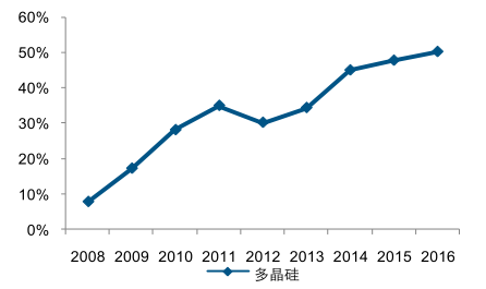 2016 年國(guó)產(chǎn)多晶硅產(chǎn)量在全球的比重也已超過 50%