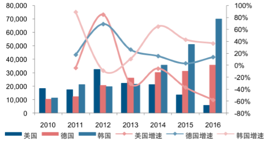 根據(jù)數(shù)據(jù),2016 年我國(guó)多晶硅進(jìn)口 14.1 萬噸,同比增長(zhǎng) 25.67%,進(jìn)口規(guī)模占總消費(fèi)量的 40%以上。其中,從韓國(guó)進(jìn)口 7.01 萬噸,同比增長(zhǎng) 36.92%;從德國(guó)進(jìn)口 3.57萬噸,同比增長(zhǎng) 14.01%。從美國(guó)進(jìn)口 0.56 萬噸,同比減少 56.76%。