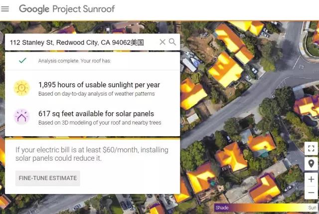 以圖中的美國用戶地址為例,每年有1895小時的可用陽光資源,可用屋頂面積617平方英尺,如果用戶每月電力賬單不低于60美金,安裝屋頂光伏長期來看就可以節省電費。