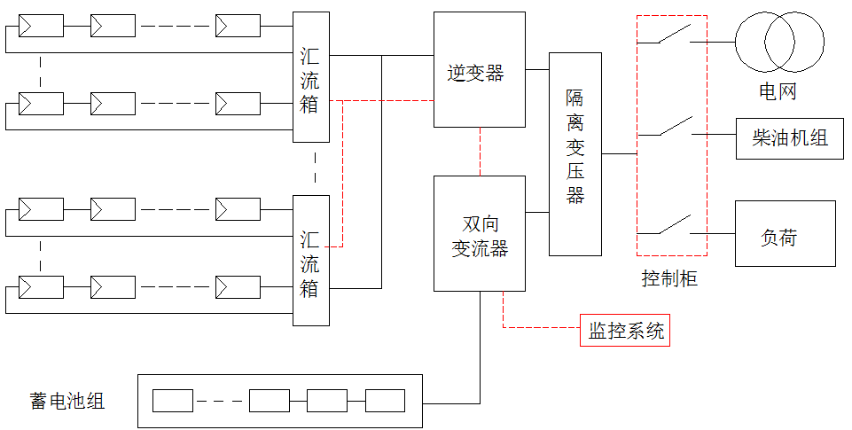 微網(wǎng)系統(tǒng)由太陽能電池方陣、并網(wǎng)逆變器、PCS雙向變流器,智能切換開關,蓄電池組、發(fā)電機、負載等構成。光伏方陣在有光照的情況下將太陽能轉換為電能,通過逆變器給負載供電,同時通過PCS雙向變流器給蓄電池組充電;在無光照時,由蓄電池通過PCS雙向變流器給負載供電。