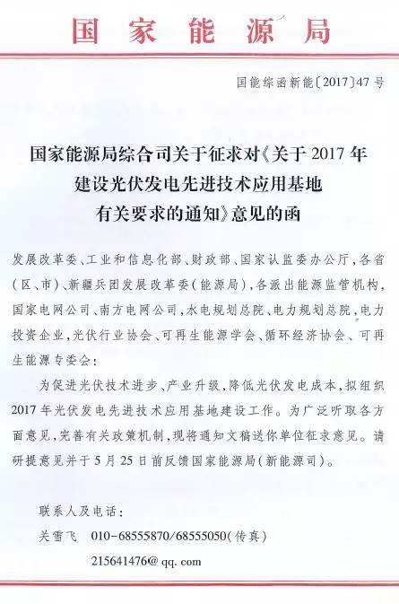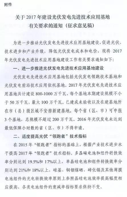 近日,華夏能源網(wǎng)(微信號(hào)sinoergy_com)獲悉,國(guó)家能源局綜合司發(fā)出了名為《關(guān)于2017年建設(shè)光伏發(fā)電先進(jìn)技術(shù)應(yīng)用基地有關(guān)要求的通知》的征求意見(jiàn)稿,對(duì)光伏發(fā)電先進(jìn)技術(shù)應(yīng)用基地建設(shè)的規(guī)劃、優(yōu)選、評(píng)分規(guī)則等做意見(jiàn)征集。