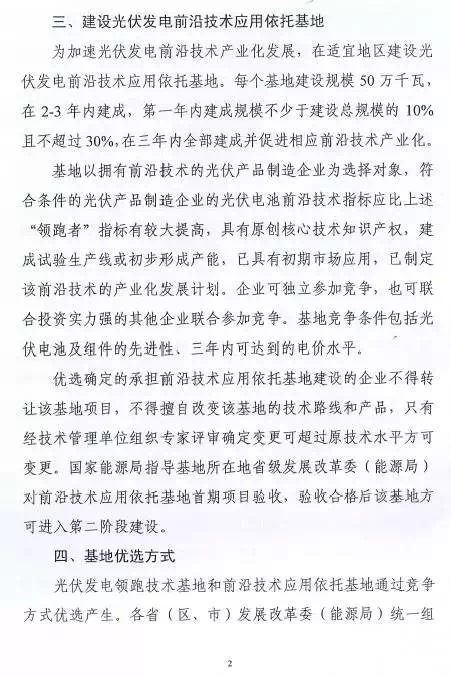 相比此前業(yè)界盛傳的“領(lǐng)跑者升級(jí)版”計(jì)劃,通知提出的“光伏發(fā)電前沿技術(shù)應(yīng)用依托基地”明顯縮水,每個(gè)基地建設(shè)規(guī)模確定為500M瓦(此前傳說(shuō)每個(gè)基地至少1GW),基地在2-3年內(nèi)建成,第一年內(nèi)建成規(guī)模不少于建設(shè)總規(guī)模的10%且不超過(guò)30%,在三年內(nèi)全部建成并促進(jìn)相應(yīng)前沿技術(shù)產(chǎn)業(yè)化。