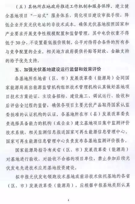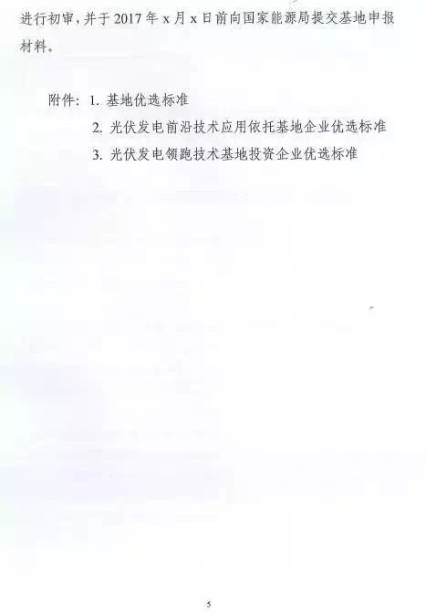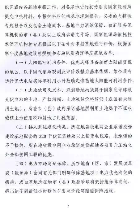 每個(gè)省(區(qū)、縣)可申報(bào)3個(gè)基地,總規(guī)模不超過(guò)2G瓦。2016年光伏發(fā)電未達(dá)到最低保障小時(shí)數(shù)的省(區(qū)、縣)不得申請(qǐng)。已建成未驗(yàn)收以及在建基地所在市(縣)級(jí)區(qū)域不安排新建基地。