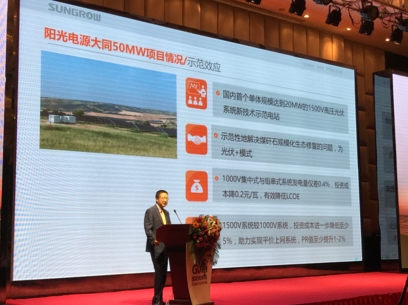 胡兵開(kāi)門(mén)見(jiàn)山,以分享者的姿態(tài),將陽(yáng)光電源在參與大同光伏“領(lǐng)跑者”基地建設(shè)近兩年來(lái)的努力和思考,向與會(huì)來(lái)賓和盤(pán)托出。胡兵介紹稱,陽(yáng)光電源憑借二十年新能源發(fā)電領(lǐng)域的技術(shù)積累和創(chuàng)新能力,將直流1500V光伏技術(shù)、跟蹤系統(tǒng)技術(shù)、生態(tài)修復(fù)技術(shù)等前沿創(chuàng)新成果,充分展示和運(yùn)用在“領(lǐng)跑者”基地項(xiàng)目建設(shè)中。