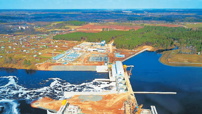中國電力工程有限公司承建的白俄羅斯維捷布斯克水電站樞紐區全景。