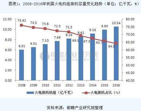 從2008年至2016年,我國火電機組裝機總量呈上升趨勢,但增速呈下降趨勢。2015年裝機總量為9.90億千瓦,同比增長8.08%;2016年裝機量達到10.54億千瓦,同比增長6.46%,增速回落1.62個百分點,低于我國同期GDP的增長率(6.7%)。