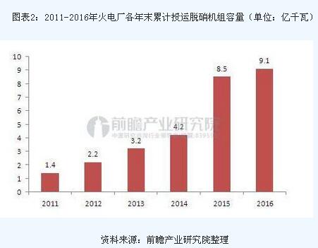 2011-2016年,我國投運的火電廠煙氣脫硝機組容量快速增長,從2011年的1.4億千瓦增長至2016年的9.1億千瓦,5年間翻了6.5倍,年復(fù)合增長率高達45.41%。2016年我國火電機組累計脫硝裝機量在9.1億千瓦左右,占火電機組總的裝機量達到86.7%。