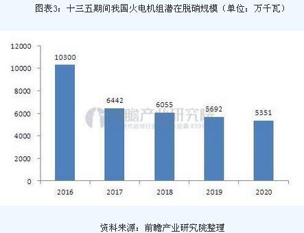 結(jié)合我國電力行業(yè)發(fā)展規(guī)劃及存量火電機組脫硝改造進展,可以分析出我國十三五期間電力行業(yè)脫硝改造市場概況,假如十三五期末我國存量火電機組脫硝率達到95%,則意味著十三五期間我國火電機組潛在脫硝規(guī)模在3.4億千瓦左右。按著目前的脫硝工程投資成本200元/千瓦計算,十三五期間我國火電脫硝行業(yè)市場規(guī)模將達到680億。