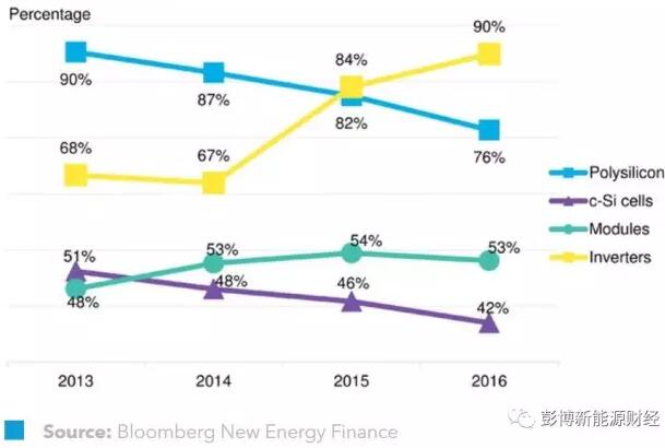 2016年,全球光伏組件的總裝機量為75GW。彭博新能源財經(jīng)分析了太陽能制造鏈上的各個環(huán)節(jié),以及其中最重要的幾家公司。