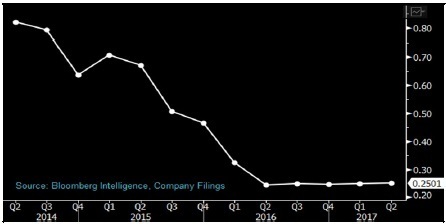 Bloomberg Intelligence 旗下分析的太陽能行業(yè)企業(yè) 2017 年業(yè)績趨勢圖