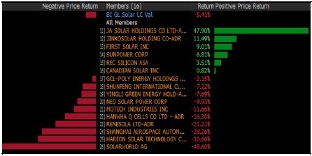 2017年,Bloomberg Intelligence 旗下研究的全球大型太陽能標桿企業(yè)指數(shù)下挫5.3%,遜于同期上漲8.5%的MSCI 全球市場指數(shù)(MSCI ACWI Index)。德國太陽能制造商 SolarWorld 在 2017 年 5 月申請了破產(chǎn)、太陽能電池板價格下跌,同時美國住宅用太陽能增長緩慢、管線項目減少,這些因素都可能打擊業(yè)內(nèi)情緒。此外一些影響可能持續(xù)2017年全年:中美貿(mào)易關系一直緊張;中國十三五規(guī)劃的增長目標也出現(xiàn)走低趨勢;內(nèi)需增長放緩對中國設備生產(chǎn)商構(gòu)成壓力。