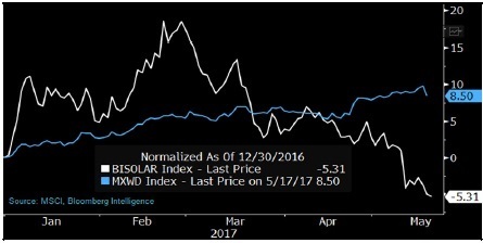 繼2016年大跌52%之后,2017年年初以來,BI 旗下行業(yè)研究的太陽能標桿企業(yè)相關股指下跌5%。市場情緒可能已經(jīng)因為中美兩國貿(mào)易關系緊張(歐盟將對中國制造太陽能電池板的反傾銷關稅延長了18個月)、國際油價下跌、SolarWorld申請破產(chǎn)(2017年年內(nèi)股價重挫49%)而進一步惡化。First Solar和SunPower(2017年股價分別漲9%和7%)這類美國太陽能企業(yè)削減成本的努力可能緩和市場對降價壓力和行業(yè)產(chǎn)能過剩的擔憂。