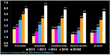 據(jù)BNEF估算,2016年全球太陽能需求約為7萬兆瓦,到2016年年底額定產(chǎn)能為16萬兆瓦。今年大型太陽能電池板供應商將成為產(chǎn)能增長的領頭羊,其中中國天合光能有限公司、加拿大太陽能光伏公司阿特斯、中國的晶科能源控股有限公司和晶澳太陽能有限公司各自產(chǎn)能將分別增長20%、34%、51%和38%。