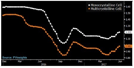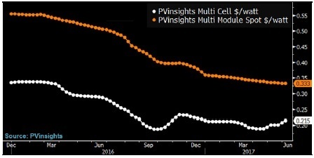 繼2016年下跌35%之后,太陽能電池板今年以來價格又跌去8%,在供應過剩形勢惡化的影響下,下半年價格還會加速下跌。造成全球產(chǎn)能進一步過剩的部分原因是美國和歐盟的貿(mào)易保護立場。太陽能報價機構(gòu)PVinsights稱,今年多晶硅太陽能電池板平均市場價格為每瓦0.35美元。降價趨勢迫使設備供應商為保住利潤而大力削減成本。由此可以預料,今年下半年競爭將更為激烈。