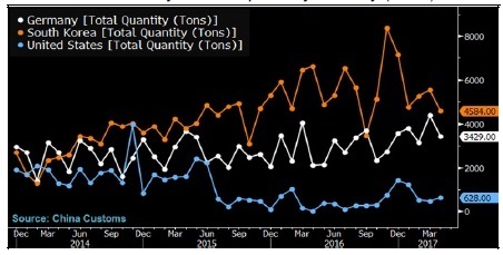 中國向不同國家進口多晶硅規(guī)模(單位:噸)