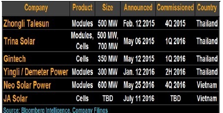 越南和泰國新開的太陽能模塊組件/電池生產(chǎn)廠