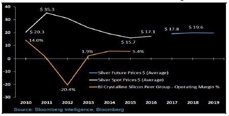 2016年現(xiàn)貨銀價均價為每盎司17.13美元,較2015年均價上漲9%,因此太陽能電池制造商2016年的盈利可能縮水。共識預期顯示,到2018年,銀價可能再攀升16%。這可能導致太陽能電池制造商的投入成本增加,但到2018年現(xiàn)貨銀價料將始終低于2012年到2014年的平均水平:每盎司24.90美元。太陽能制造商的盈利已經(jīng)與銀價呈現(xiàn)負相關。太陽能組件價格和多晶硅成本對制造商盈利也很重要。