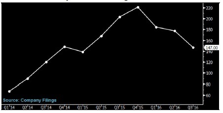 BI 旗下行業(yè)研究的全球太陽能標桿企業(yè)市銷率中值由2015年第四季度的0.47倍降至0.25倍,這主要源于相關企業(yè)股價暴跌54%。在去年6月底開始盛傳中國政府削減新能源補貼以前,這些標桿企業(yè)的營業(yè)收入去年上半年曾大幅增長。中國減少補貼幫助市場消化了設備供應商過剩的一些供應量。而由于預期全球需求增長放緩,產(chǎn)能會再度回升,市場已經(jīng)更加擔憂2017年的產(chǎn)品降價和生產(chǎn)商利潤縮水。