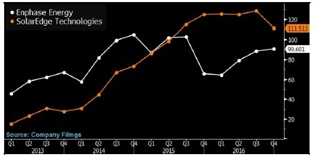 2017年1季度,太陽能逆變器供應商Enphase推出最新款微型太陽能逆變器,集太陽能發(fā)電、儲能和家用能源管理系統(tǒng)于一身。其競爭對手SolarEdge正在向歐洲市場推廣類似產(chǎn)品。家用能源管理系統(tǒng)給逆變器供應商帶來了售后服務的商機,比如提高能源效率的服務、監(jiān)控以及保養(yǎng)設備。逆變器供應商還可能開發(fā)新的銷售商機,以滿足市場需求和電網(wǎng)的服務,比如儲能集群產(chǎn)品。