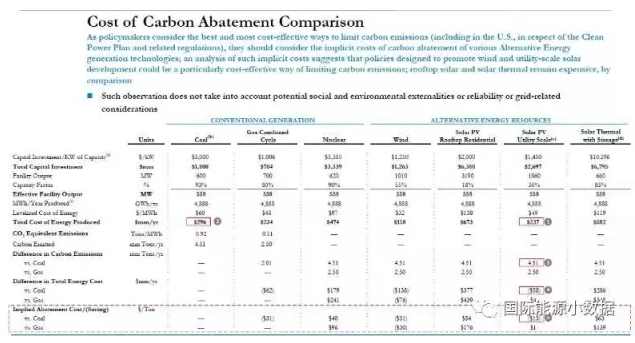 帶儲能的光熱發(fā)電:煤電每千瓦投資10296美元,容量因子85%,全周期度電成本為11.9美分/千瓦時,碳排放不計(jì);相對煤電減排成本63美元/噸。