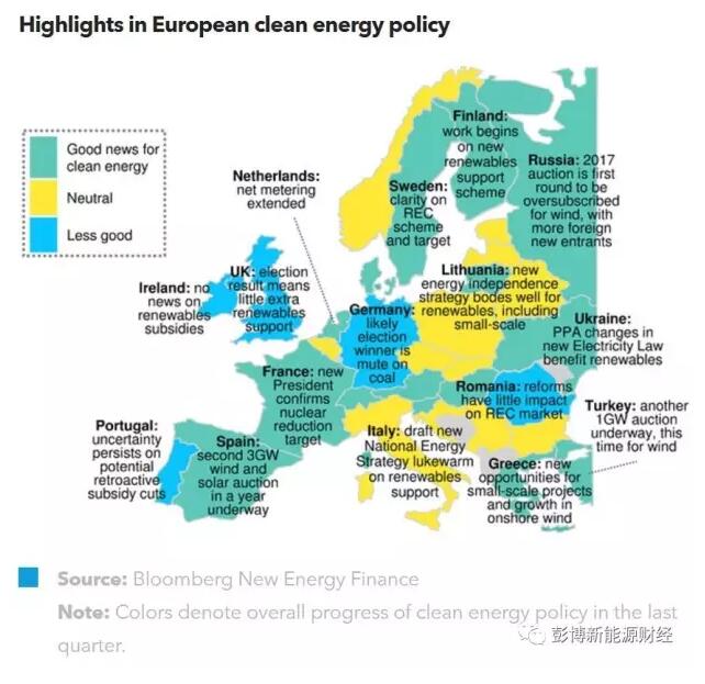 歐盟政府意圖削減可再生能源項目補貼的態(tài)度使歐洲近期可再生能源項目招標數(shù)量激增 - 相比去年的5GW, 2017年上半年的總招標容量達14GW。在2017年第二季度可再生能源項目政府補貼同比下降49%之后,出現(xiàn)這一招標結(jié)果對整個歐洲地區(qū)可再生能源項目的投資而言,絕對是個利好消息。歐洲大部分國家出臺的政策都是積極支持可再生能源發(fā)電發(fā)展的。在本歐洲電力政策展望報告所研究的32個國家中,2017年第二季度支持政策力度減弱的國家有8個,而本季度僅有4個國家面臨這一狀況。