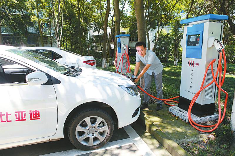 廣安城區市民用直流充電樁為新能源汽車充電。廣安市今年將完成1000臺充電樁建設,可同時供3000至4000輛新能源汽車充電。