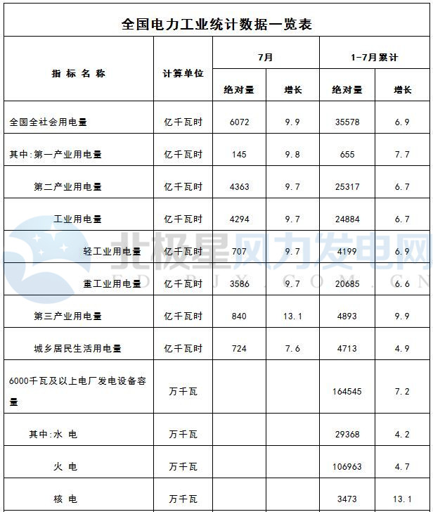 國家能源局昨日發布1-6月份全國電力工業統計數據。數據顯示,1-7月全國6000千瓦及以上風電發電設備容量為15522萬千瓦,同比增12.5%。以下為具體數據: