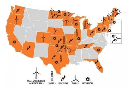 美國有27個州是生產各種小型風力渦輪機組件的所在地