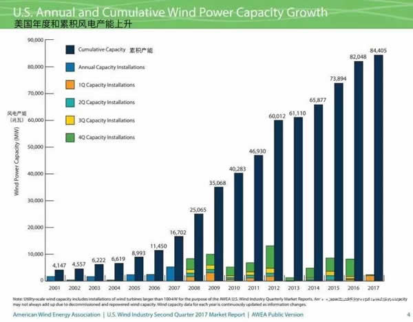 美國能源部能量效率與可再生能源辦公室(Energy Efficiency and Renewable Energy, EEER)的代理助理部長Daniel Simmons表示,“風電行業持續提高裝機,并在2016年為美國提供了約6%的電力。正如報告里所解釋的,聯邦補貼,州內授權和技術進步的結合將繼續幫助推動新的風力發電量增加。”