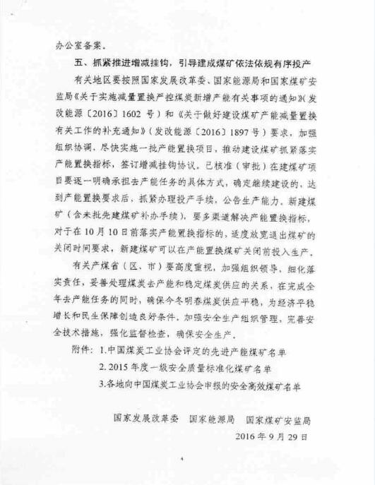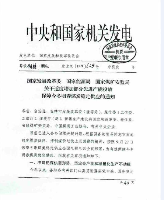 9月30日,國家發展改革委、國家能源局、國家煤礦安監局聯合下發的《關于適度增加部分先進產能投放 保障今冬明春煤炭穩定供應的通知》(發改電〔2016〕605號)要求,在遵循市場經濟規律和發揮企業市場主體作用的前提下,適當增加安全高效先進產能釋放,以盡快改善當前部分用煤企業存煤偏低的狀況,滿足冬儲煤的實際需要,有效保障冬季供暖、供氣和發電生產用煤。