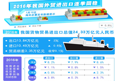 外貿數據逐季回穩 結構持續優化1月13日,海關總署發布2016年中國進出口情況。數據顯示,2016年,中國貨物進出口總值24.33萬億元人民幣,比2015年下降0.9%,外貿增速降幅較2015年收窄6.1個百分點。對此,專家指出,在復雜嚴峻的形勢下,... [詳細]