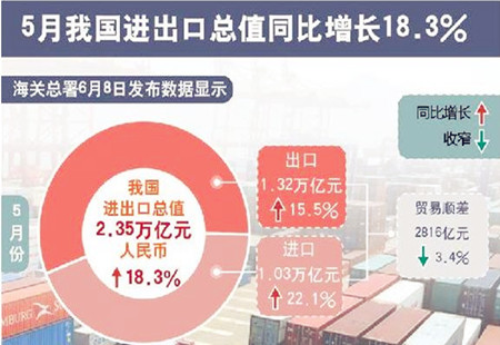 5月我國進(jìn)出口總值同比增長18.3%海關(guān)總署8日發(fā)布數(shù)據(jù)顯示,5月份,我國進(jìn)出口總值2.35萬億元人民幣,比去年同期增長18.3%。其中,出口1.32萬億元,增長15.5%;進(jìn)口1.03萬億元,增長22.1%;貿(mào)易順差2816億元,收窄3.4%。 [詳細(xì)]
