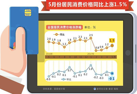 統(tǒng)計(jì)局:5月CPI同比上漲1.5%國家統(tǒng)計(jì)局今日公布數(shù)據(jù):2017年5月份,全國居民消費(fèi)價(jià)格總水平同比上漲1.5%。其中,城市上漲1.7%,農(nóng)村上漲1.1%;食品價(jià)格下降1.6%,非食品價(jià)格上漲2.3%;消費(fèi)品價(jià)格上漲0.7%,服務(wù)價(jià)格上漲2.9%。1-... [詳細(xì)]