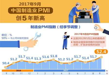 9月中國制造業PMI為52.4% 創近年新高據統計局網站消息,2017年9月份,中國制造業采購經理指數(PMI)為52.4%,比上月上升0.7個百分點,制造業繼續保持穩中向好的發展態勢,擴張步伐有所加快。 [詳細]