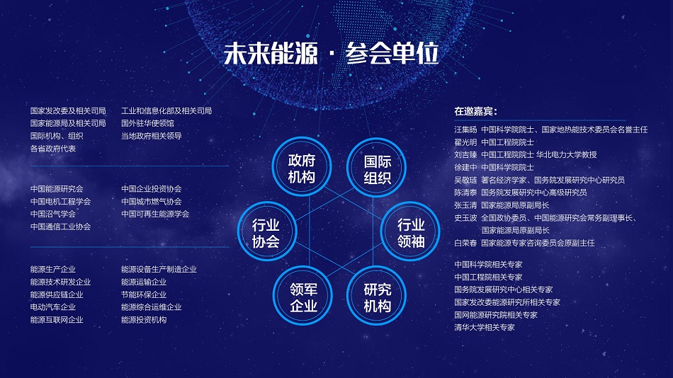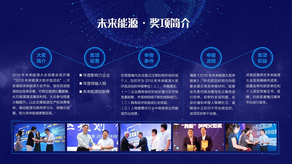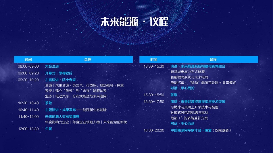 “未來能源大會”,旨在打造一個定期的跨行業、綜合性的高端交流共享平臺。本屆大會將圍繞“新時代”能源生產、傳輸、轉化、利用及跨行業的一系列重大變革,討論推進能源生產消費的智能化體系、多能協同綜合能源網絡、與能源系統協同的信息通信基礎設施建設等話題。借助大會營造開放共享的能源互聯網生態體系,建立新型能源市場交易體系和商業運營平臺,推動分布式能源、儲能和電動汽車應用、智慧用能和增值服務、綠色能源靈活交易、能源大數據服務應用等新模式和新業態的實現。