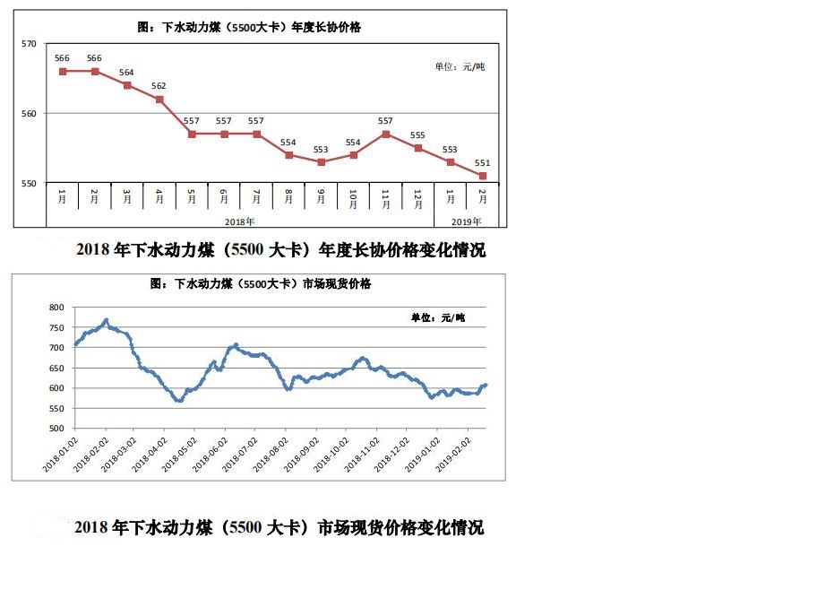 一是 2018 年動力煤中長期合同價格(5500 大卡下水煤)穩定在綠色區間,全年均價558.5 元/噸,比上年下降 9.5 元/噸。二是現貨價格受市場預期影響波動較大,價格總水平保持平穩,秦皇島 5500 大卡下水煤市場平倉價年內最高 770 元/噸,最低 570 元/噸;但全年均價比上年僅增加 9 元/噸。三是山西焦肥精煤綜合售價全年平均 1528 元/噸,比上年上升 172 元/噸。