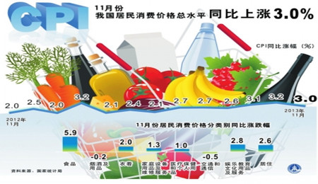國(guó)家統(tǒng)計(jì)局昨天公布數(shù)據(jù),2013年11月份CPI同比上漲3.0%,環(huán)比下降0.1%。PPI同比降幅有所收窄,但連續(xù)第21個(gè)月為負(fù)值,顯示制造業(yè)仍有通縮壓力。市場(chǎng)... [詳細(xì)]