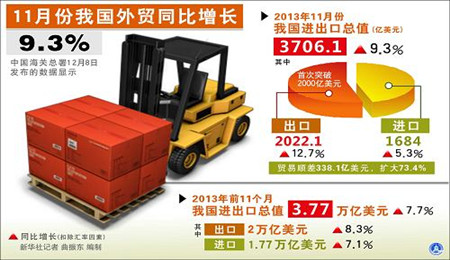 前11月外貿(mào)穩(wěn)定增長(zhǎng) 11月份出口創(chuàng)新高海關(guān)總署12月8日公布1至11月外貿(mào)進(jìn)出口情況。據(jù)海關(guān)統(tǒng)計(jì),今年前11個(gè)月,我國(guó)進(jìn)出口總值23.43萬億元人民幣(折合3.77萬億美元),扣除匯率因素同比(下同)增長(zhǎng)7.7%。其中出口12.44萬億元人民幣(折合2萬億美... [詳細(xì)]