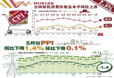 5月CPI重回“2”時代 定向降準影響不大昨日(6月10日),國家統計局發布的數據顯示,2014年5月份,全國居民消費價格總水平(CPI)同比上漲2.5%,重回“2”時代并創年內新高,全國工業生產者出廠價格(PPI)同比下降1.4%,環比下降0.1%。 [詳細]