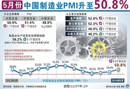 PMI連升3月達50.8% 需求端和生產端雙雙回暖國家統計局服務業調查中心和中國物流與采購聯合會6月1日發布的中國制造業采購經理指數(PMI)顯示,2014年5月中國制造業PMI為50.8%,比上月上升0.4個百分點,連續3個月回升,表明我國制造業繼續穩中向好。由于制造... [詳細]