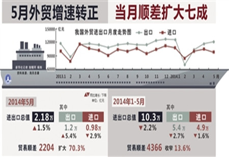 5月進出口總值轉正 單月順差創5年新高昨日(6月8日),海關總署公布的前5月進出口數據表明,我國外貿已止跌微增。其實,剔除去年的套利貿易水分,我國外貿一直保持著個位數的溫和增長。但是5月單月同比出口增幅達7%,進口出現下降,為-1.6%,單月順差為359.2... [詳細]