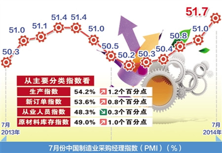 7月中國制造業PMI升至51.7%中國物流與采購聯合會、國家統計局服務業調查中心發布的2014年7月份中國制造業PMI為51.7%,比上月上升0.7個百分點。從12個分項指數來看,同上月相比,除從業人員和供應商配送時間指數回落外,其它各項指數均呈現回升。 [詳細]