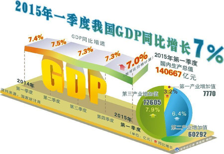 2015年第一季度GDP增長7%4月15日訊,國家統計局新聞發言人盛來運介紹了一季度國民經濟指標主要數據,國民經濟運行總體平穩,結構調整穩步推進,新生動力加快孕育。初步核算,一季度國內生產總值140667億元,按可比價格計算,同比增長7.0%。 [詳細]
