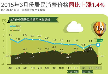 3月CPI同比增長1.4% 連續7個月低于2%2015年3月份,全國居民消費價格總水平同比上漲1.4%。其中,城市上漲1.4%,農村上漲1.2%;食品價格上漲2.3%,非食品價格上漲0.9%;消費品價格上漲1.1%,服務價格上漲2.0%。1-3月平均,全國居民消費價... [詳細]